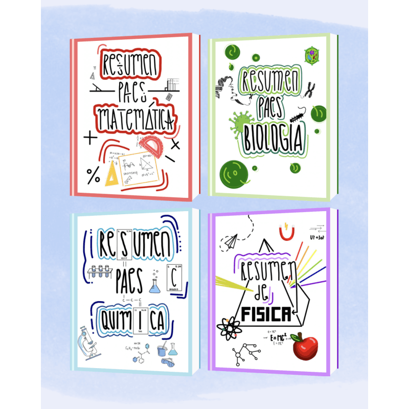 ¿Buscas destacar en la PAES? Este pack completo de 4 resúmenes te ofrece los contenidos clave de Física, Química, Biología y Matemáticas, todo en un formato claro, preciso y enfocado en los temas que más aparecen en la prueba de acceso universitaria.
